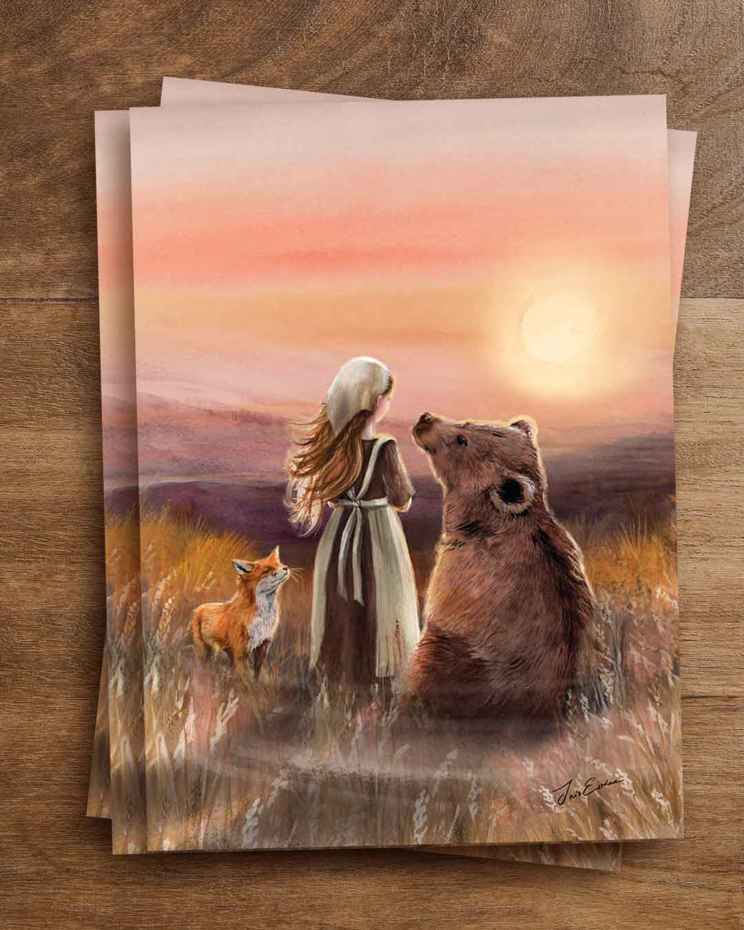 Geniet van deze prachtige zomerse geïnspireerde ansichtkaart. De illustratie toont een jonge vrouw die geniet van het magische gezelschap van een vos en een beer terwijl ze naar een prachtige zonsondergang staart.