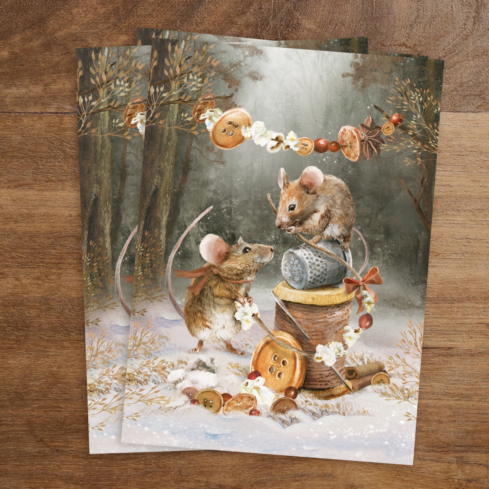 Een woordje van Iris Esther: Herinner je je die scène uit Disney's Assepoester waarin de muisjes besluiten om samen te werken en een jurk te maken van willekeurige spullen die ze hadden gevonden? Nou, dat was de scène die mij inspireerde voor deze kaart. Het was mijn favoriet toen ik klein was. Het ging niet om de jurk, maar om de inspanning, hoe ze elkaar hielpen, de ziel en het lied dat ze in hun werk hadden gestopt. Dus dat, en een liefde voor nostalgische, zelfgemaakte kerstdecoraties, en je hebt het perfecte recept voor een seizoensgroetkaart. (Naar mijn bescheiden mening) P.S: Zou het niet geweldig zijn als we een beetje meer zoals deze muisjes konden zijn?
